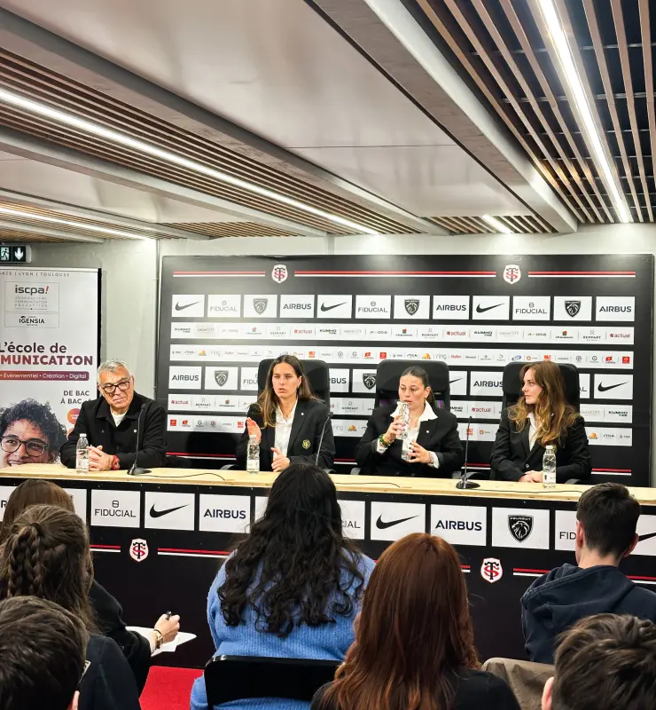 Toulouse, 26 mars 2026 – Ce n’est pas un match, mais presque. Dans l’enceinte mythique du Stade Ernest-Wallon, les étudiants de première année de l’ISCPA Toulouse ont vécu une expérience aussi intense qu’une rencontre à guichets fermés. Les C1 – Bachelor Communication – et les J1 – Bachelor Journalisme – ont uni leurs forces pour organiser une conférence de presse d’exception avec les joueuses du Stade Toulousain Féminin, ambassadrices d’un rugby en pleine ascension. Un projet pédagogique 100% terrain, où chacun a joué son rôle : les uns en maîtres du jeu (logistique, communication, relations presse), les autres en reporters aguerris, micro en main et stylo.