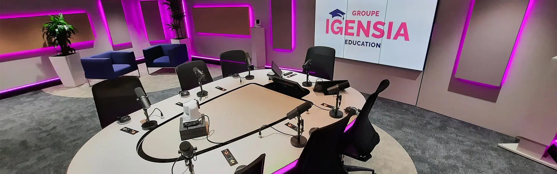 - Le desk : table pour accueillir le présentateur et ses invités pour un J-T